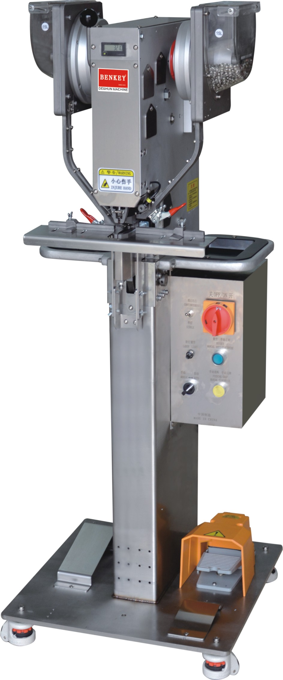 用途: 适用于各類五爪扣、牛仔扣、工字扣、金屬四合扣、塑膠四合扣、大白扣、車縫扣、西褲扣、撞釘、雞眼、急鈕等鈕扣制品裝訂。 說明: 把鈕扣放進對應的4個料鬥,開機會自動轉動料鬥,自動把鈕扣排滿軌道,自動把鈕扣送到上下模具,電動伺服馬達帶動,隻要踩下踏腳開關便可裝訂自如,簡單易用。上下模具對向運動,穿透力好。更換配件可以裝訂其它鈕扣。 安全: 伺服馬達帶動,PLC控制,裝配先進的防打手感應裝置,機器運作中如手指在模具下,機器會感應到手指,立即停機并自動恢複到停機位置,不會壓傷手指。 配置: 1、有CE認證的電子安全防打手裝置 2、鈕扣自動供應裝置(免手工放鈕扣,安全) 3、裝釘壓力緩沖自動調節器(布料厚薄不用調節) 4、自動計數器 5、可調亮度的鐳射燈對位裝置 6、有連打,單打2種裝釘模式選擇 7、有自動,手動2種運作模式選擇 8、可以調節的定位闆(五爪扣,四合扣适用) 9、裝有方便移動的腳輪 10、裝有人體工程學的左腳踏闆 11、采用可調速度,恒扭矩的伺服馬達 12、裝訂速度可調 13、送料馬達運轉時間長短可調 特點: 裝有歐盟CE安全認證的安全防打手功能。 |