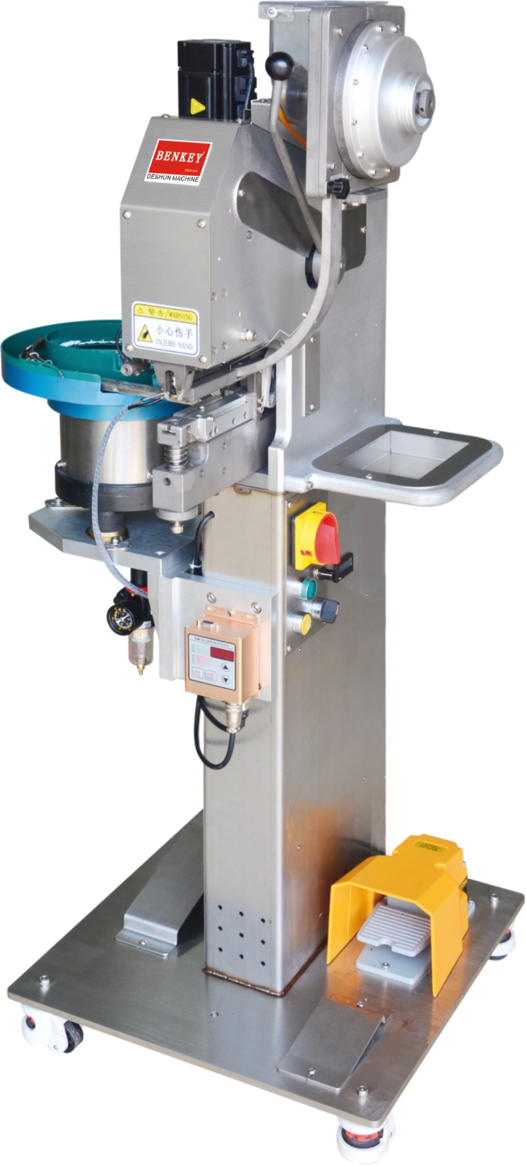 用途: 适用于各類五爪扣、牛仔扣、工字扣、金屬四合扣、塑膠四合扣、大白扣、車縫扣、西褲扣、撞釘、雞眼、急鈕等鈕扣制品裝訂。 說明: 把鈕扣放進對應的4個料鬥,開機會自動轉動料鬥,自動把鈕扣排滿軌道,自動把鈕扣送到上下模具,電動伺服馬達帶動,隻要踩下踏腳開關便可裝訂自如,簡單易用。上下模具對向運動,穿透力好。更換配件可以裝訂其它鈕扣。 安全: 伺服馬達帶動,PLC控制,裝配先進的防打手感應裝置,機器運作中如手指在模具下,機器會感應到手指,立即停機并自動恢複到停機位置,不會壓傷手指。 配置: 1、有CE認證的電子安全防打手裝置 2、鈕扣自動供應裝置(免手工放鈕扣,安全) 3、裝釘壓力緩沖自動調節器(布料厚薄不用調節) 4、自動計數器 5、可調亮度的鐳射燈對位裝置 6、有連打,單打2種裝釘模式選擇 7、有自動,手動2種運作模式選擇 8、可以調節的定位闆(五爪扣,四合扣适用) 9、裝有方便移動的腳輪 10、裝有人體工程學的左腳踏闆 11、采用可調速度,恒扭矩的伺服馬達 12、裝訂速度可調 13、送料馬達運轉時間長短可調 特點: 裝有歐盟CE安全認證的安全防打手功能。 |