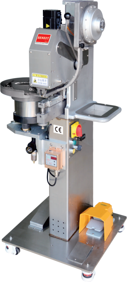 把鈕扣放進對應的2個料鬥,開機會自動轉動料鬥,自動把鈕扣排滿軌道,自動把鈕扣送到上下模具,伺服電機驅動,隻要踩下踏腳開關便可裝訂自如,簡單易用。更換配件可以裝訂其它鈕扣。