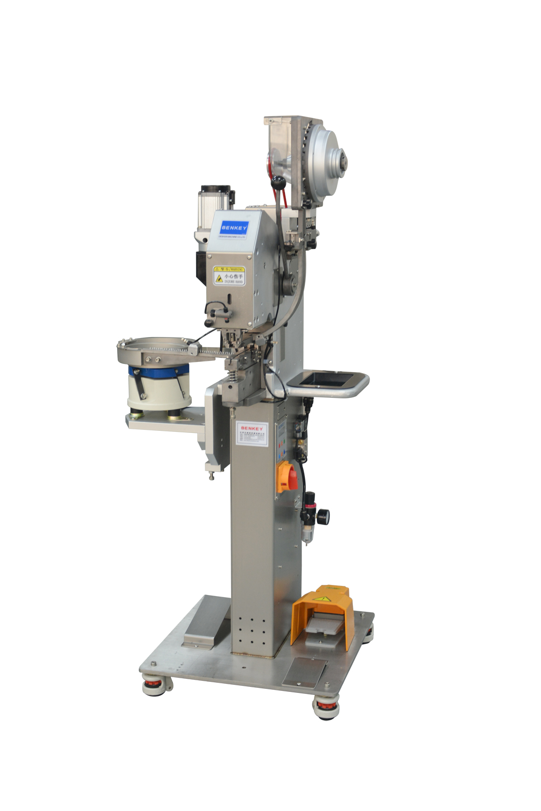 把鈕扣放進對應的2個料鬥,開機會自動轉動料鬥,自動把鈕扣排滿軌道,自動把鈕扣送到上下模具,伺服電機驅動,隻要踩下晴腳開關便可裝訂自如,簡單易用。更換配件可以裝訂其它鈕扣。